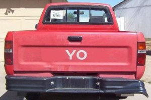 Stranger Two:  A tall-ish woman with long-ish dishwater, light brown, hair, generally tied messily up at the back of her neck, works in an office in the same office building that I work in.  She drives a small maroon Toyota pick-up truck.  She has removed the leading ‘to,’ and trailing ‘ta,’ so the back of the truck loudly says, ‘YO.’  She wears jeans that are too big, and sag down on her hips, not quite so far as the ridiculous kids that wear their jeans half way down their asses, but approaching that level.  Her black t-shirts are in the multiple ‘XL’ range, which probably helps hide just how far her jeans are sliding down.  When she’s walking up to the building, she always cuts through the ‘garden,’ inste